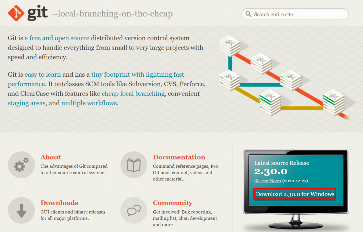 Git Bash 설치 파일을 받기 위해 공식 홈페이지(https://git-scm.com/)에서 다운로드 한다.