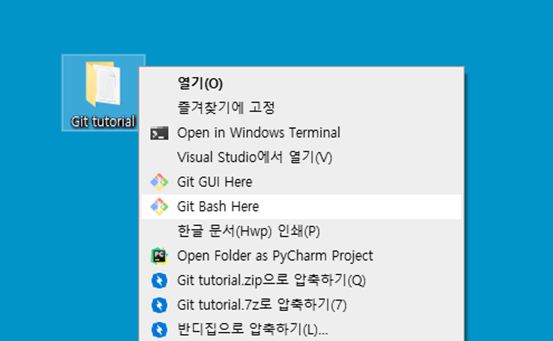 Repository와 연동할 폴더를 선택한다. 폴더를 우클릭해서 [Git Bash Here]으로 Git Bash를 실행한다.