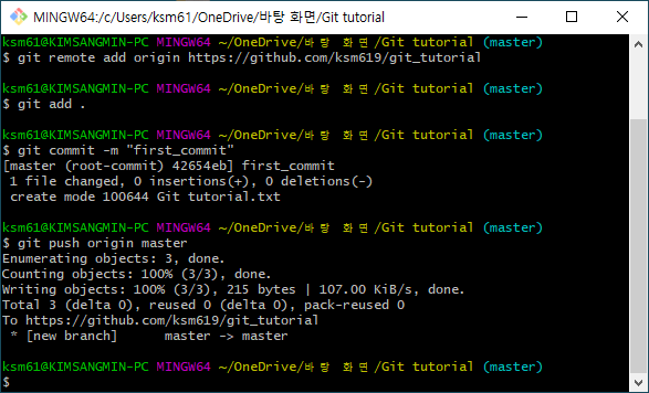 이렇게 Git tutorial.txt 파일이 올라간 것을 확인할 수 있다.