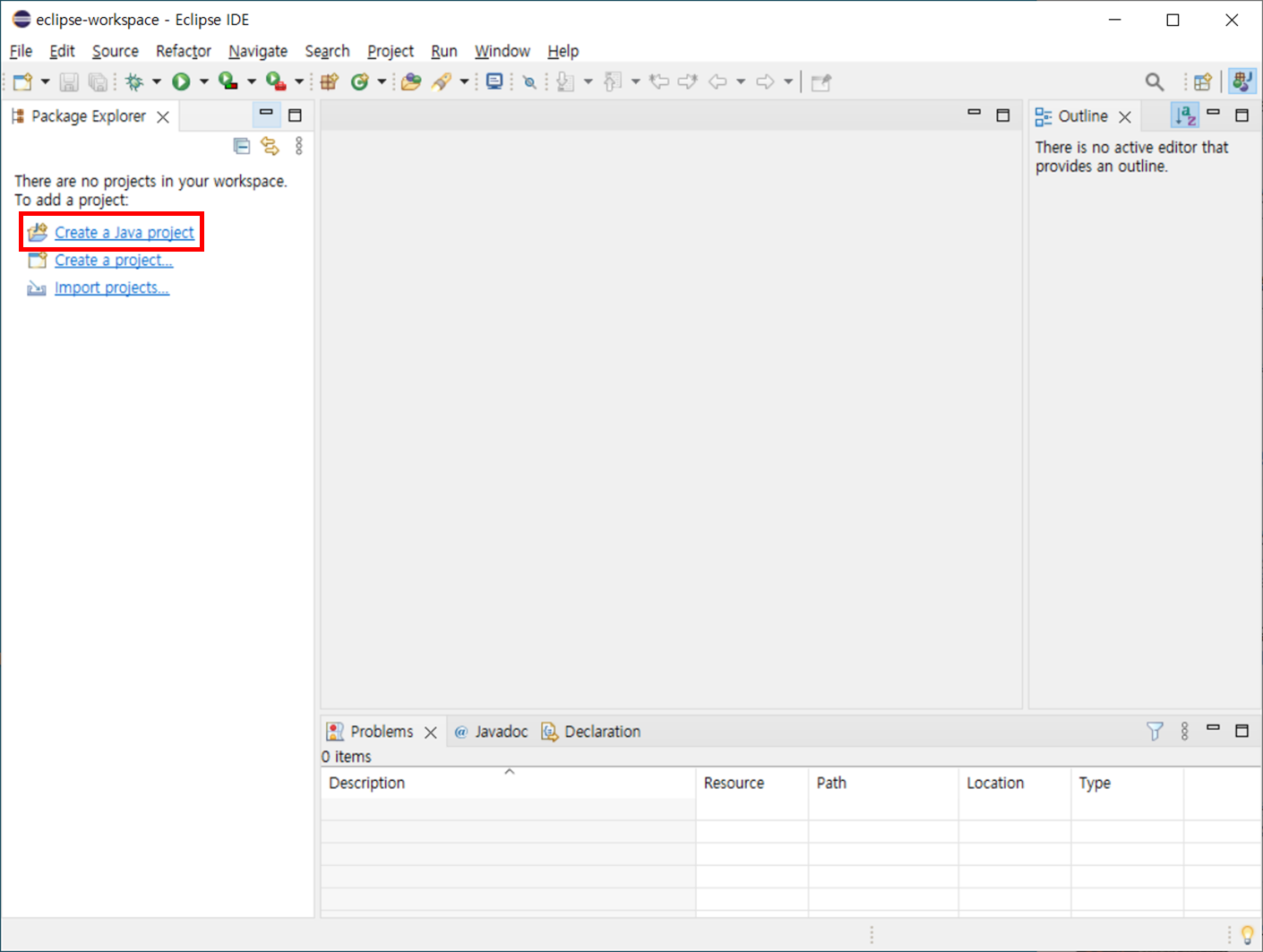 1) [Create a Java project] 클릭한다. 또는 [File]-[New]-[Java project]를 선택한다.