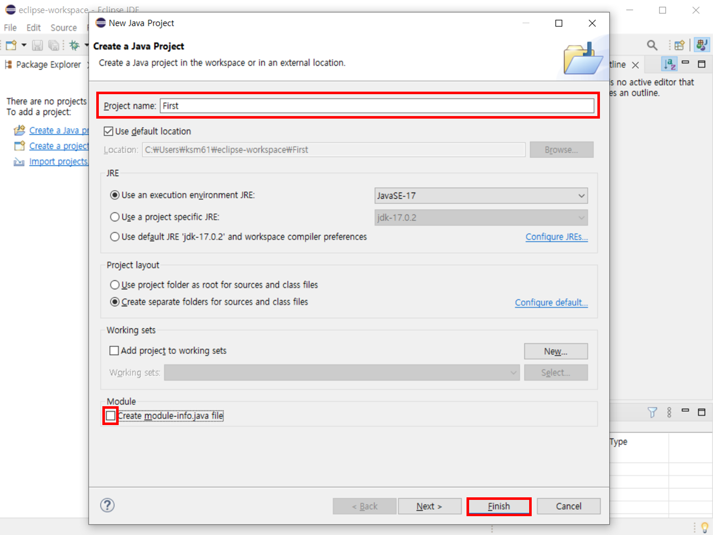 2) Project name 이름을 설정하고 [Create module-info.java file] 체크박스를 해제 후 [Finish]를 클릭한다.