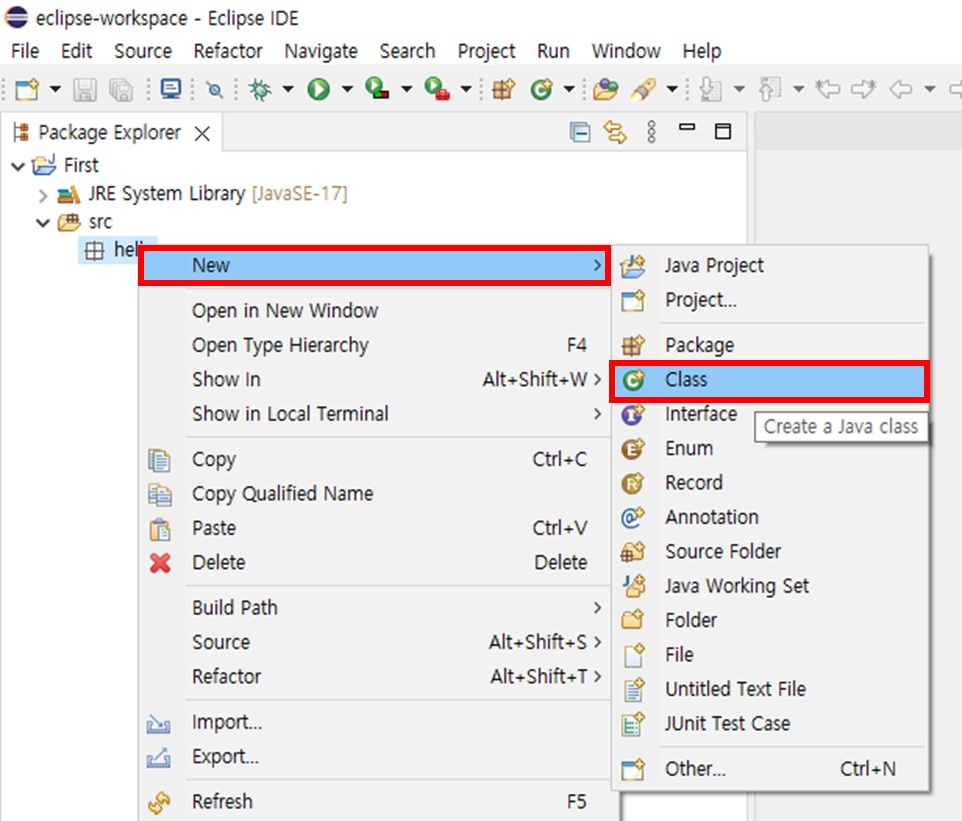5) 패키지 아래에 클래스를 만든다. hello 패키지를 선택하고 오른쪽 마우스 버튼을 클릭해서 [New]-[Class] 메뉴를 선택합니다.