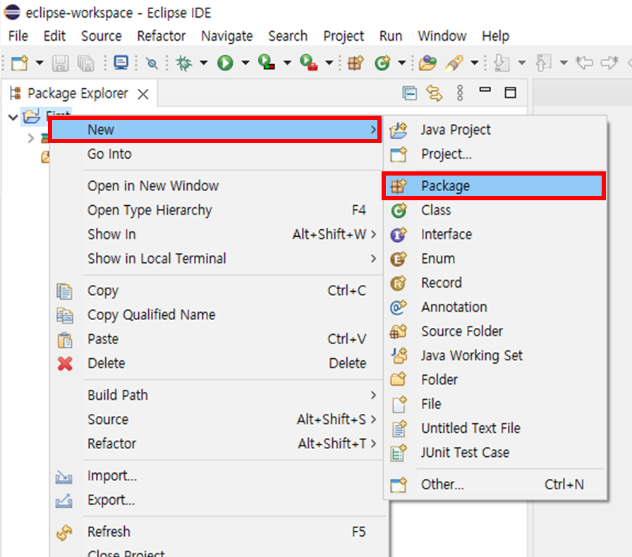 3) First 프로젝트를 선택하고 오른쪽 마우스를 클릭하면 메뉴가 나온다. [New]-[Package]를 선택한다.