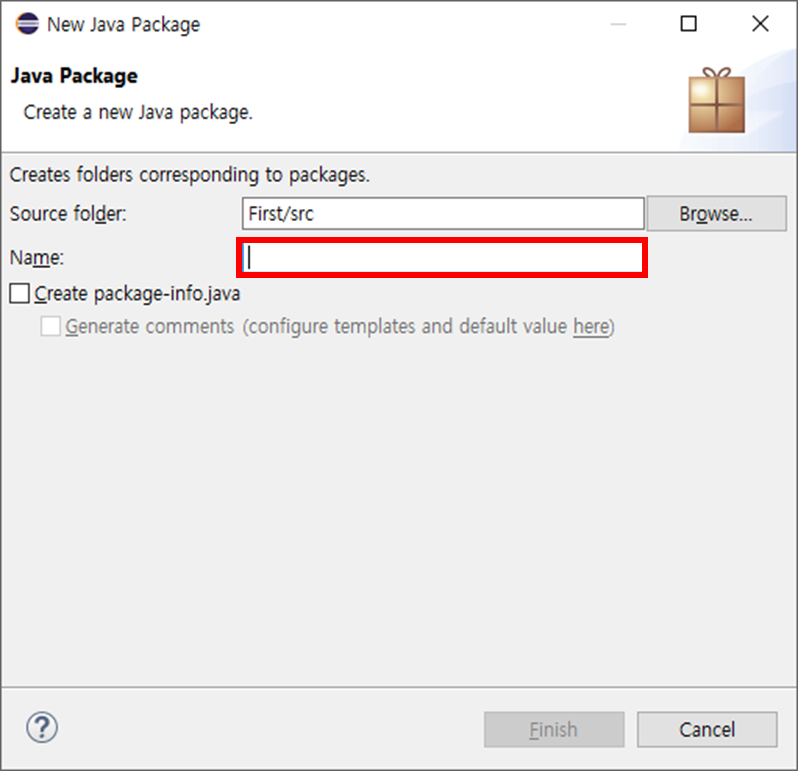 4) 패키지 이름을 작성한다. (패키지 이름은 항상 소문자로 쓴다.)