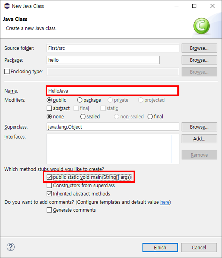 6) 클래스 이름을 설정하고, 아래 [public static void main(String[] args)] 항목을 선택하여 main()함수를 추가한다.