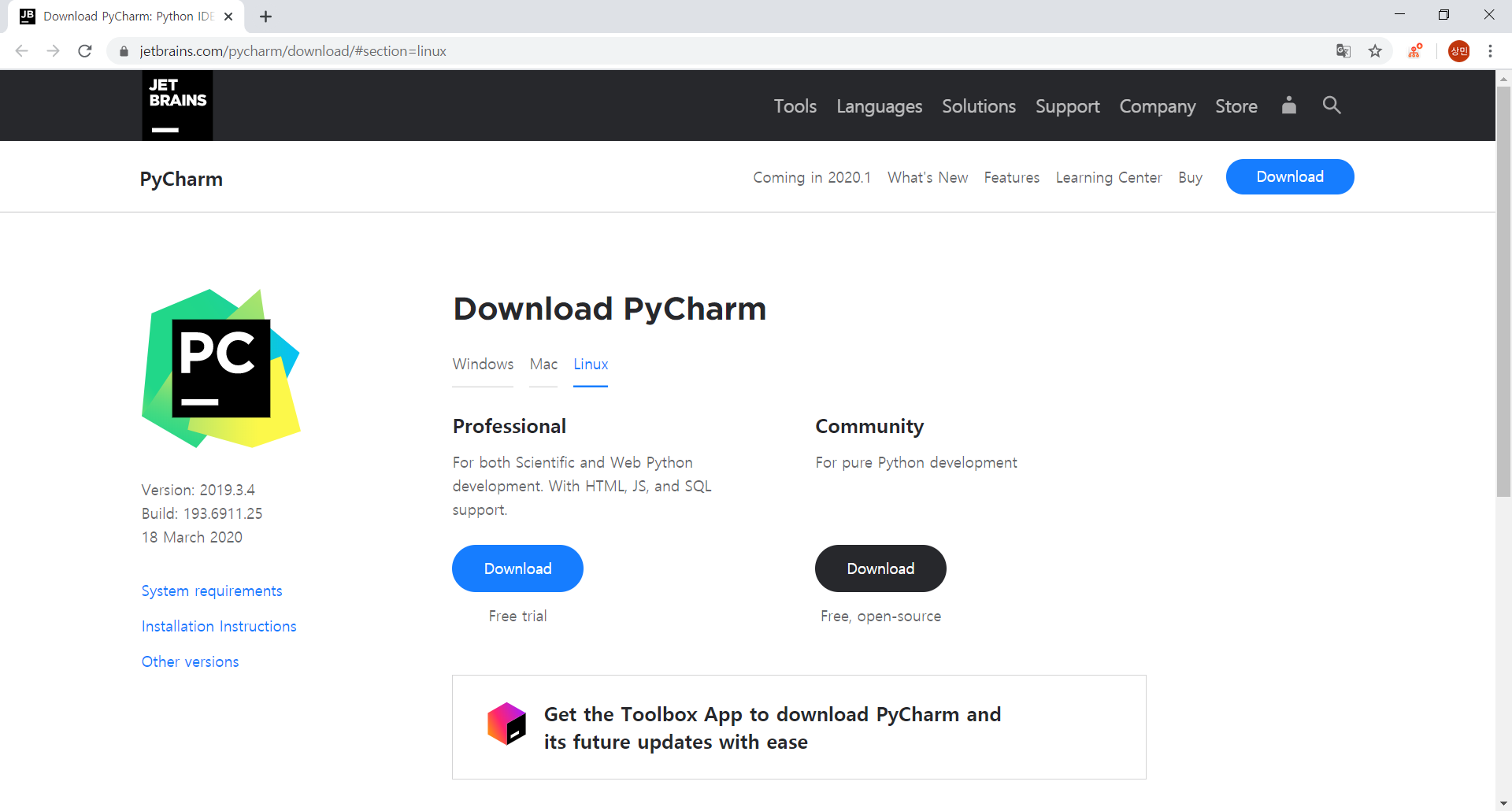 https://www.jetbrains.com/pycharm/download/#section=linux
