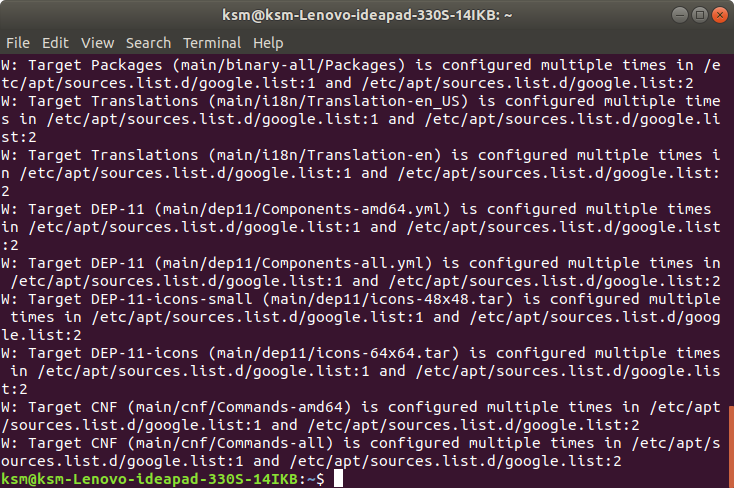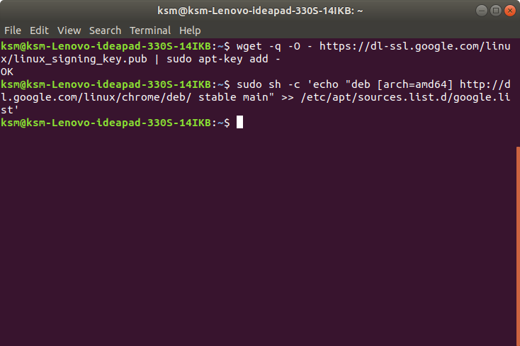 sudo sh -c 'echo "deb [arch=amd64] http://dl.google.com/linux/chrome/deb/ stable main" >> /etc/apt/sources.list.d/google.list