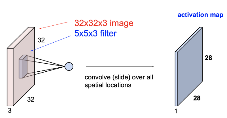 위의 그림처럼, 필터(=커널:kernel)가 이미지의 위에서부터 차례대로 내려오면서 Dot products를 진행한다. 다시 말해 32 x 32 x 3의 크기의 이미지에 5 x 5 x 3의 필터로 차례대로 훑고 내려오면서 5 x 5 x 3 (75번)의 Dot product 연산을 한다. 또한 각각의 Dot product 결과로 하나의 숫자를 return 한다. 즉, 필터가 위치해있는 하나의 location 당 하나의 숫자로 표현되는 것이다.