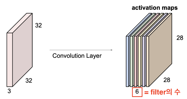 input으로 들어온 이미지를 activation의 관점에서 representation을 하면 오른쪽과 같이 새로운 형태의 이미지로 변환되는 것이다. 이때 새로 생성된 activation maps의 depth는 적용한 필터의 수와 동일하다. 이렇게 생성된 activation map을 다음 layer의 input값으로 전달된다.