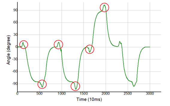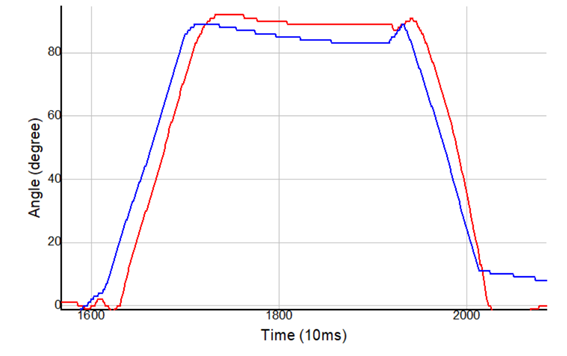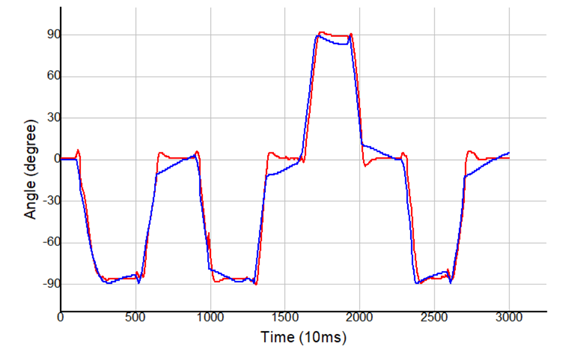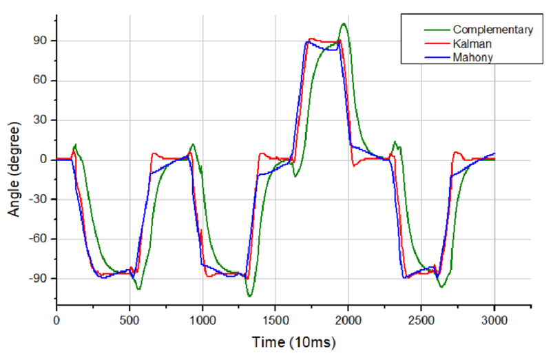 다음은 직접 필터들을 비교한 결과 그래프이다. MPU6050에서 각각의 필터(Complementary/Kalman/Mahony)를 거친 결과를 그래프로 나타내었다. 실험은 10ms마다 각도 값을 정수로 측정하였고, 물리적으로 각도를 –90°에서 +90°까지 변화시킨 것이다.