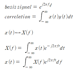 x(t)를 가지고 X(f) 스펙트럼을 구하고 싶을 때, x(t)에는 1Hz 성분이 얼마나 있는지, 2Hz 성분이 있는지, 모든 주파수에 대해 둘 사이의 correlation을 측정하면 그것이 곧 스펙트럼이 된다.