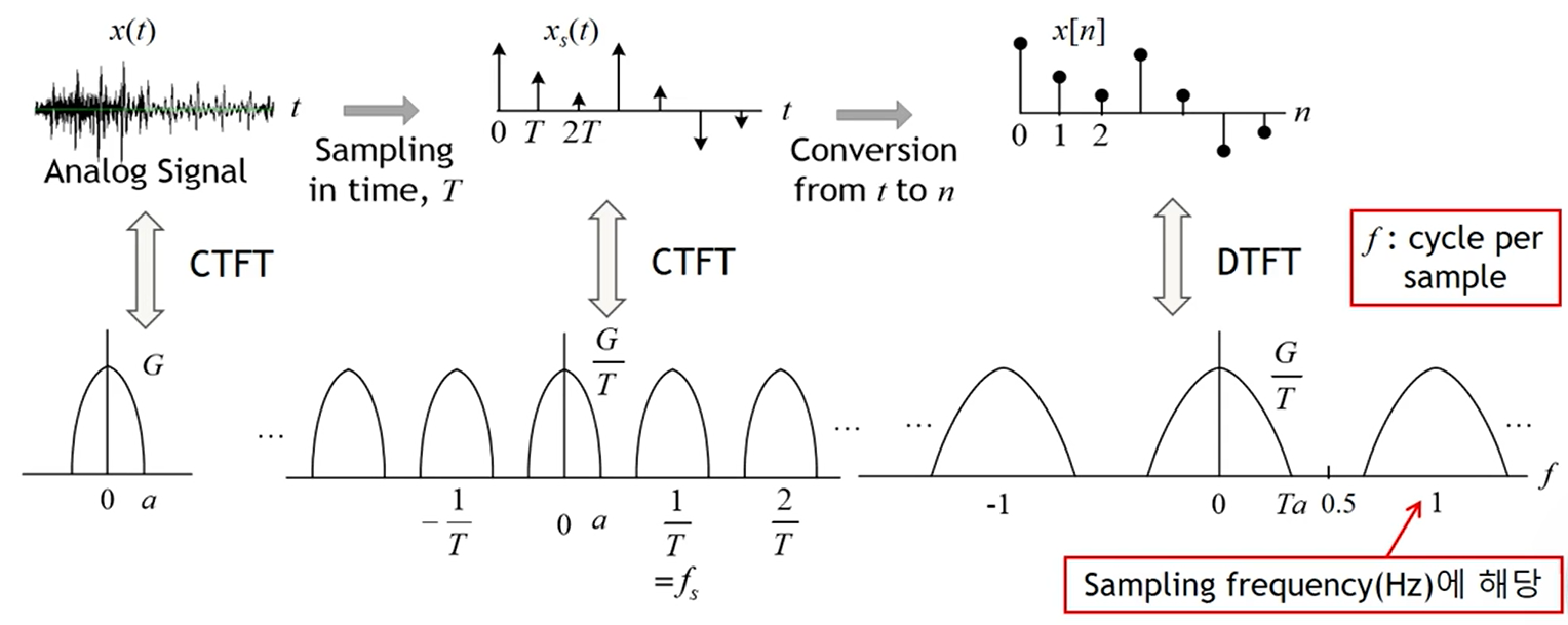 정리하자면 x(t)가 x[n]으로 바뀌는데 sampling 간격은 T이다. 그렇다면 스펙트럼은 T배 벌어지게 되고, 1마다 반복되게 된다. 1마다 반복되는데 1이 1/T에 해당되는 위치인데 sampling frequency(hz)에 해당한다.