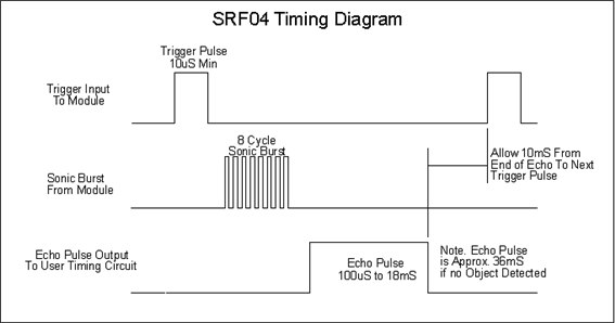 HC-SR04는 측정 가능 거리가 400CM이므로 HC-SRF04보다 Echo Pulse 시간이 보다 더 길 수 있다. 그리고 Echo Pulse가 Low로 떨어지게 되면 다시 Trigger에서 신호를 보낼 때까지 10ms의 Delay가 필요하다. 그 이유로는 40KHz의 8개 초음파 Pulse가 모두 사라질 때까지 대기해야 하기 때문이다. 만약 8개 중 1개가 제일 가까운 장애물을 감지하고 들어왔는데, 나머지 7개의 버스트가 들어오지 않았기 때문에 Delay가 필요하다는 것이다.