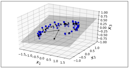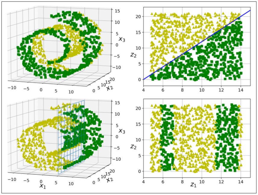 대부분의 실제 환경에서 training instance는 모든 차원에 걸쳐 균일하게 분산되어있지 않는다. 그래서 모든 training instance는 고차원 공간의 훨씬 낮은 차원의 부분 공간내에 있다. 3D data set를 2D data set으로 줄이는 모습이다.