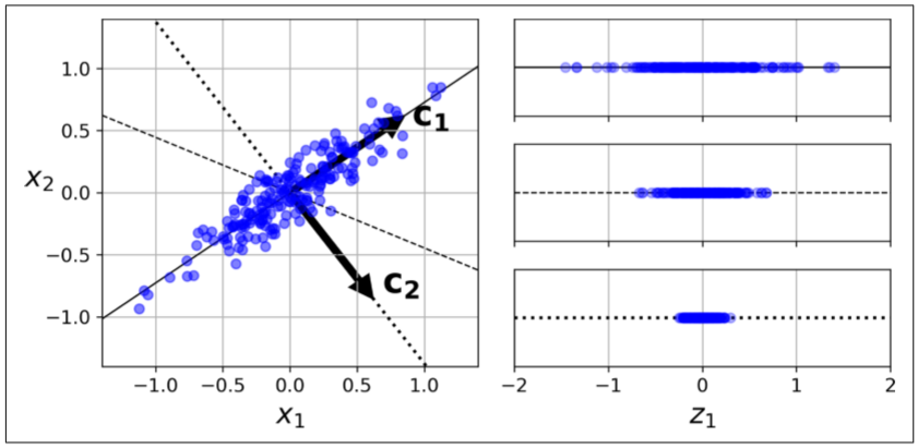 예를들어, 위의 그림에서는 2차원 데이터셋이므로 PCA는 분산을 최대로 보존하는 단위벡터 c1이 구성하는 축과 이 축에 직교하는 c2가 구성하는 축을 찾게 된다.
