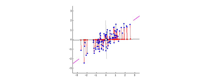 최대 분산량을 유지하는 축을 선택하는 것이 합리적이다. 다른 예측보다 정보가 덜 손실될 가능성이 높다. 원래 데이터 집합과 해당 축에 대한 투양 간의 평균 제곱 거리를 최소화하는 축이 결국 최대 분산량을 유지하는 축이된다.