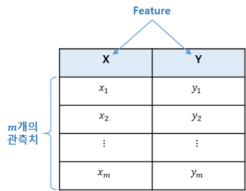먼저, 주성분(PC)를 구하기 위해서는 공분산에 대해 알아야 한다. 공분산(covariance)은 2개의 특성(또는 변수)간의 상관정도를 나타낸 값이다. 예를들어, 아래의 그림과 같이 두 개의 특성에 대해 공분산을 구하면 다음과 같다.