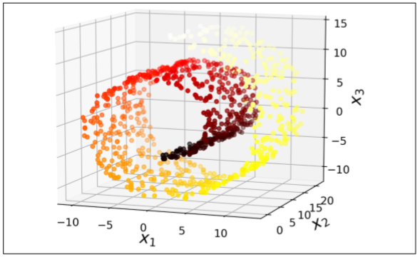 그러나 Projection이 Dimensionality Reduction에 가장 적합한 방법은 아니다. 대부분의 경우 < Figure 8-4 >에 표시된 유명한 스위스 롤 장난감 데이터 세트에서와 같이 하위 공간이 비틀리고 회전할 수 있다.