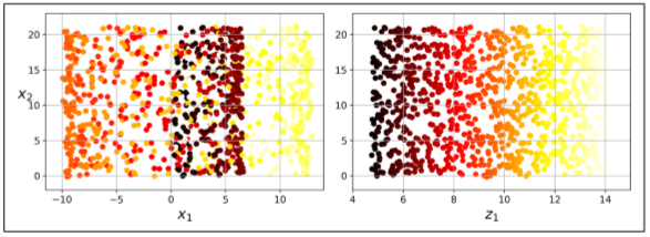 평면에 projection하면 < Figure 8-5 >의 왼쪽같이 스위스 롤의 여러 레이어가 함께 스쿼시 된다. 실제로 원하는 것은 < Figure 8-5 >의 오른쪽에서 스위스 롤을 풀어 2D data를 얻는 것이다.