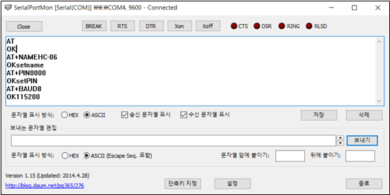 PC와 HC-06를 연결하기 위해 3.3V TTL신호를 USB 포트에 연결할 수 있도록 해주는 FT232RL 컨버터를 사용했다. AT command 모드로 진입하기 위해 KEY 핀에 +5V를 인가했고, 블루투스 모듈의 LED가 깜빡이는 속도가 줄어들게 되면서 AT 모드로 진입하는 것을 확인했다. 터미널 프로그램은 SerialPortMon을 사용했다.