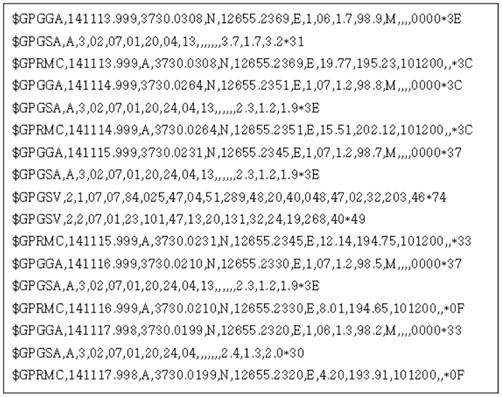 현재 GPS 통신에서는 ‘NMEA-0183’을 표준 프로토콜로 사용하고 있다. 다음은 그 예이다.