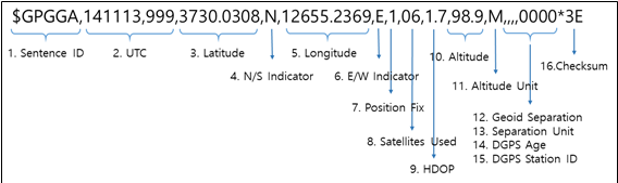 GPGGA는 'Global Positioning System Fix Data'를 의미한다. GPGGA는 총 17개의 field를 가진다. 참고로 예제에서는 12~15 필드는 비어 있다. 그리고, 17번 필드는 그림에서는 보이지 않는데, 그 이유는 Terminator 문자인 CR/LF이기 때문이다.