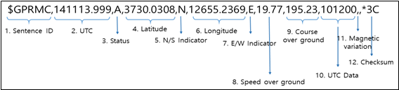 -Sentence ID : 문장을 구분하는 용도다. Sentence Name이라고도 한다. Device ID 다음에 오는 문자 3개. 예를 들면 'RMC'를 말한다.