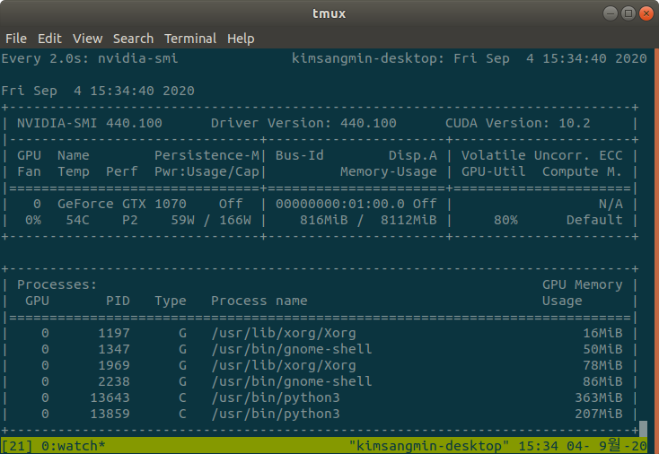 GPU는 80%, GPU메모리는 각각 363MB, 207MB가 할당된 것을 확인할 수 있다.