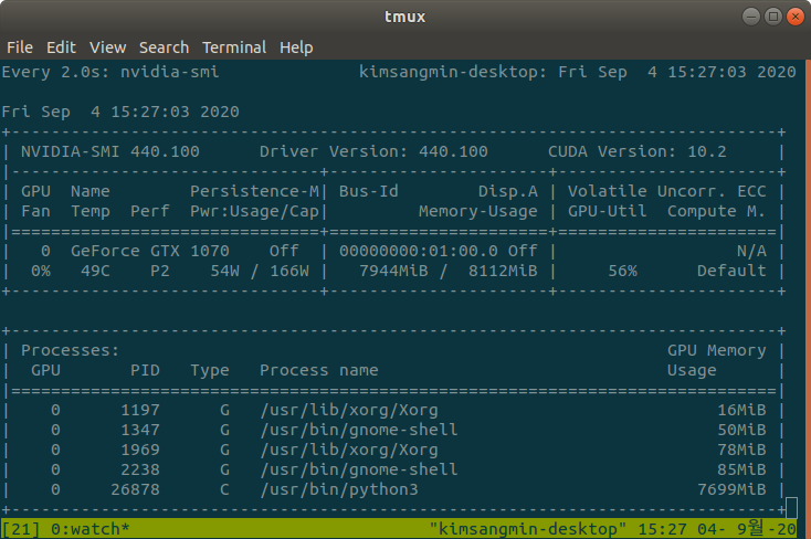 GPU는 56%, GPU 메모리는 7699MB가 할당된 것을 확인할 수 있다.