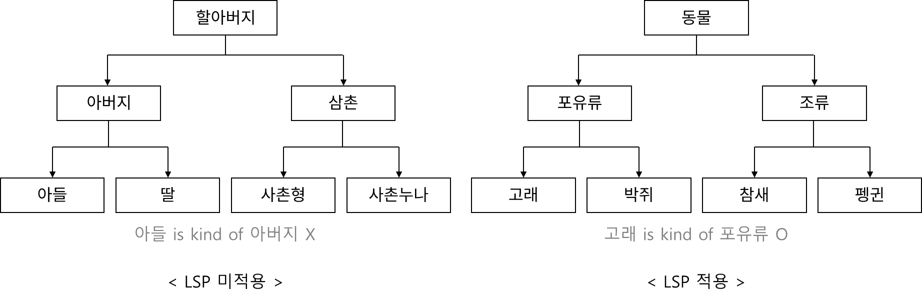 - 프로그램의 객체는 프로그램의 정확성을 깨뜨리지 않으면서 하위 타입의 인스턴스로 바꿀 수 있어야 한다.